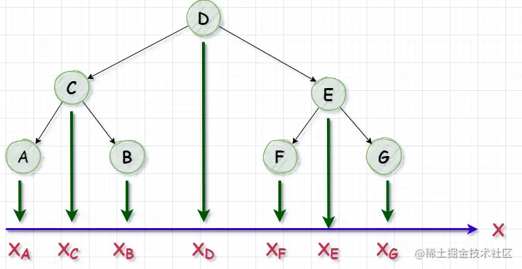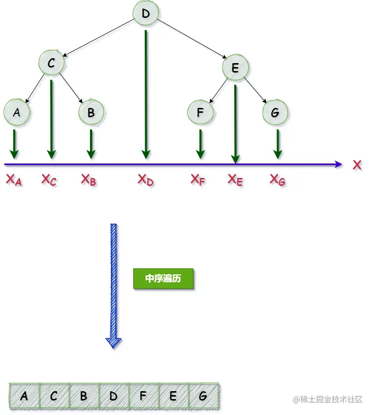 如果按照: XA ---> XG 的顺序将节点存储到数组中,那么每个节点对应的数组下标可以看作是节点的横坐标;在二叉树中,中序遍历的结果恰好是这个顺序;