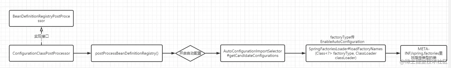 AutoConfigurationImportSelector类的getAutoConfigurationEntry方法会先判断自动配置是否开启,如果开启,会去扫描所有配置在spring.factories里的name为EnableAutoConfiguration的类。
