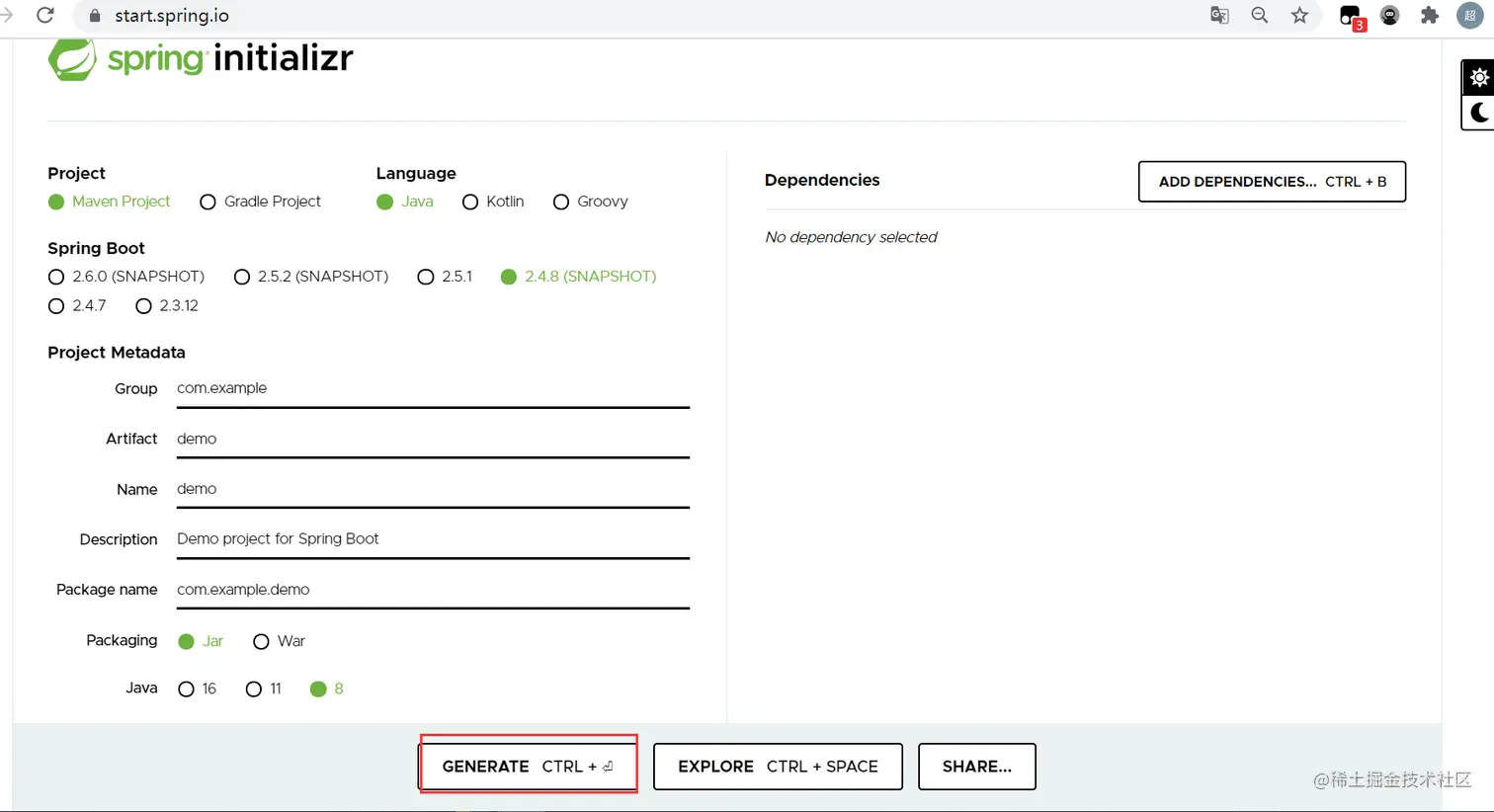 可以在start.spring.io进行快速生成一个SpringBoot的项目。