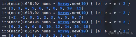 Array.new(10) e会从0循环到9 每次赋完值后进行运算并给数组赋值