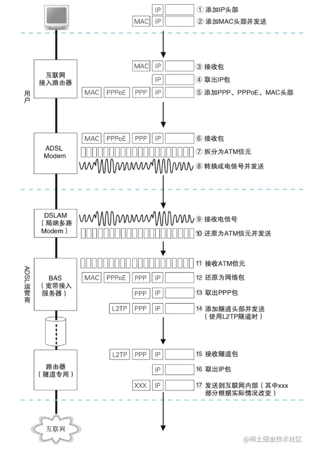 BAS 在收到用户路由器发送的网络包之后,会去掉 MAC 头部和PPPoE 头部,然后用隧道机制将包发送给网络运营商的路由器。然后用隧道机制将包发送给网络运营商的路由器