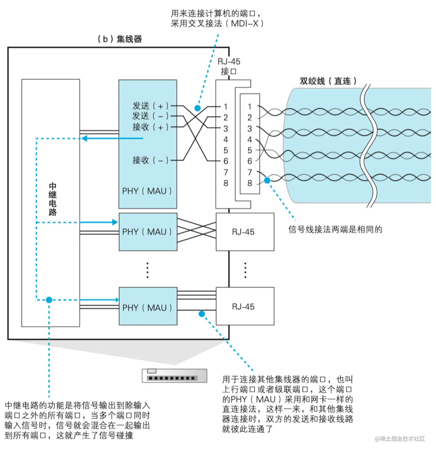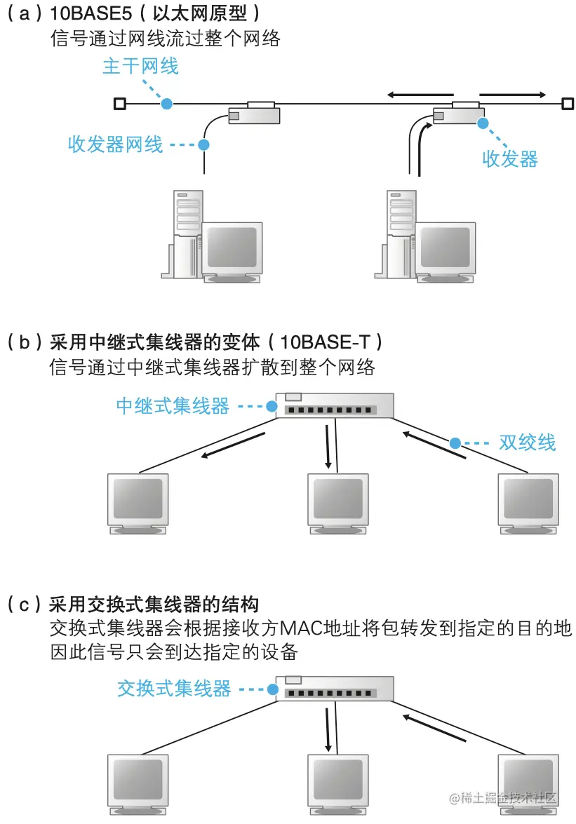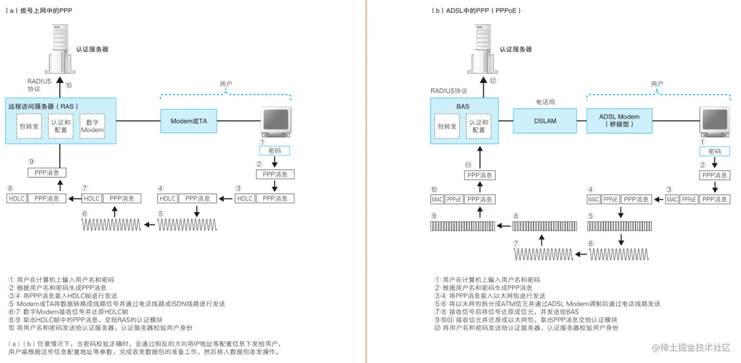 本部分更建议加深对鱼 传输过程图的印象,里面把整个ADSL上网通信流程描绘的非常细致,在细节上有较多的网络硬件的知识,对于个人这种学软件的人来说比较难啃,这里就当留个印象以后有机会深入的时候再学习吧。(当然几乎用不着)