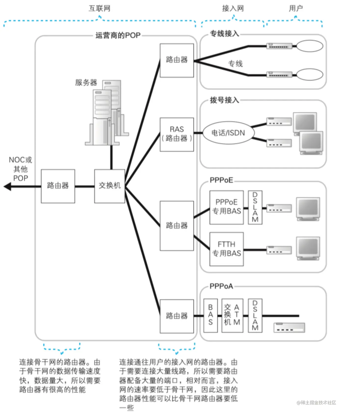 NOC: Network Operation Center,网络运行中心。NOC是网络运营商的核心,可以抽象的看作一个非常高性能的支持非常非常多用户连接的高吞吐路由器,可以看作一个超大号的接入网。