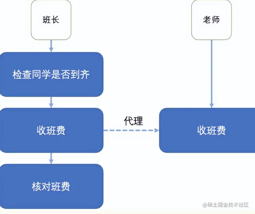 又比如班长代理老师来上交班费,他在“上交班费”的动作之前,还进行了检查班级同学是否到齐、向每一位同学收班费、核对班费金额,最后再上交班费。