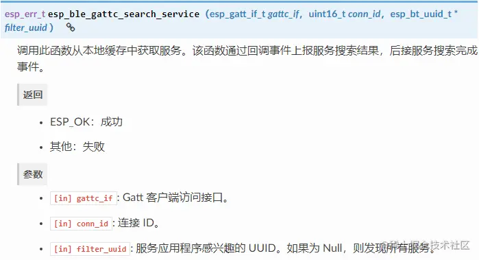 ESP_GATTC_CFG_MTU_EVT生成一个。此事件用于搜索远程设备上可用的已知服务。搜索是通过使用esp_ble_gattc_search_service()函数和由以下定义的服务 ID 执行的: