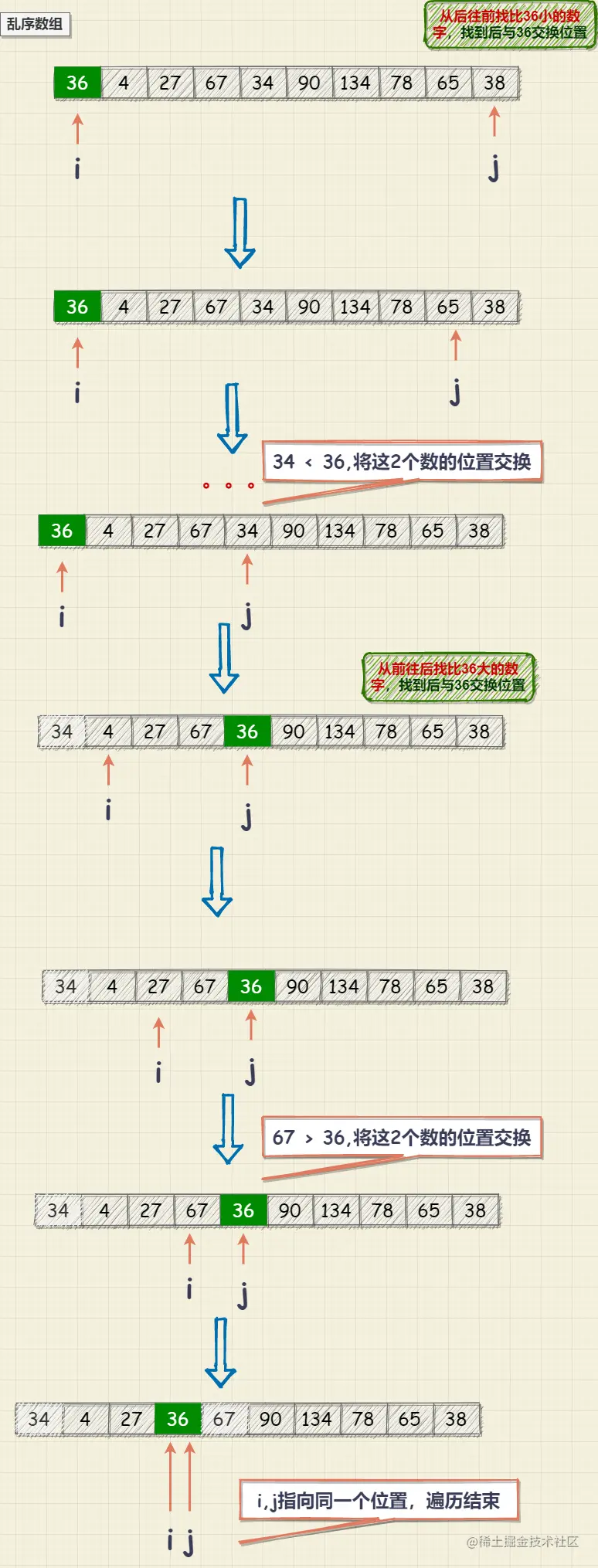 代码实现使用双指针: i=0,j=len-1;从后往前找比36小的数字,找到后与36交换位置;再从前往后找比36大的数字找到后交换位置,当指针碰撞时,说明遍历完了整个数组;