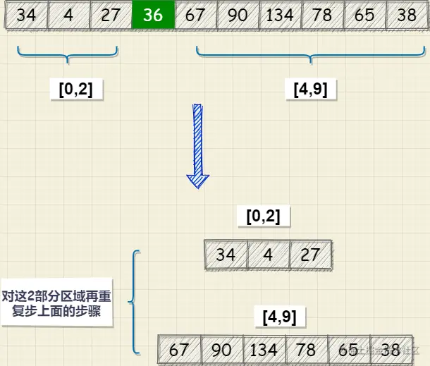 - 分别对2个区域的子数组重复步骤一,直到不能分割为止;