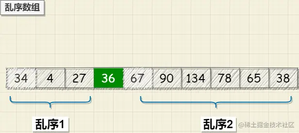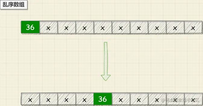 假设36,在排序后的数组中位置如图所示;那么在36前面的数字一定是小于或者等于36,在36之后的数字一定是大于或者等于36; 利用这个特性找36在数组中的正确位置时遍历数组将大于36的数字放在36后面,将小于36的数字放在36前面;当遍历完整个数组时,就能够确定36的位置了;