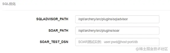SOAR的可执行文件路径,路径需要完整,docker镜像内已经集成,docker镜像内已经集成 * 1.4.0以前的docker版本配置成/opt/soar * 1.4.0以以后的docker版本配置成/opt/archery/src/plugins/soar