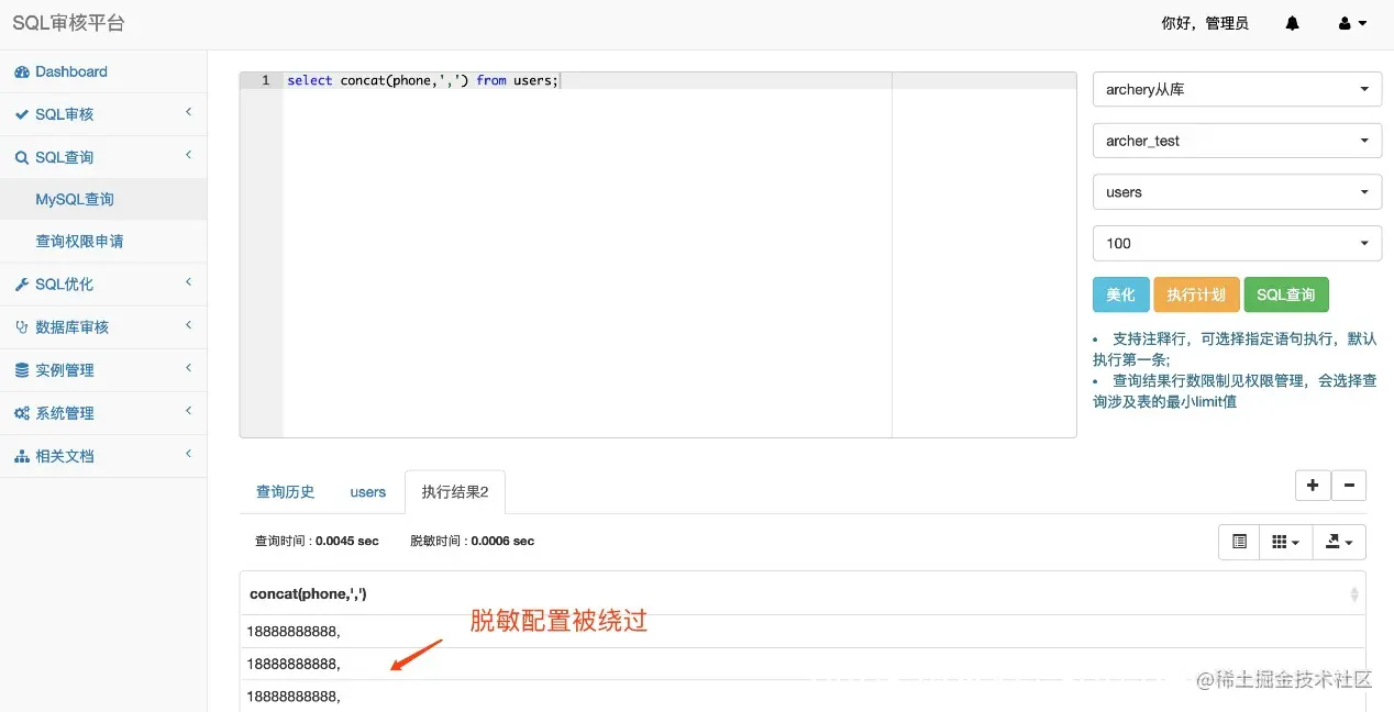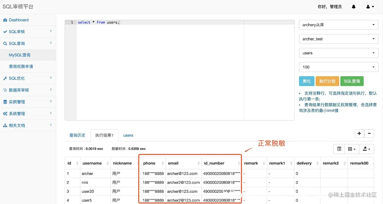 是否开启动态脱敏,会利用inception语法树打印,结合后台设置的脱敏字段和脱敏规则,对查询数据进行脱敏。遇到无法解析的语句是报错还是返回未脱敏的数据同样由QUERY_CHECK参数控制 * 正常脱敏: * 开启QUERY_CHECK后执行不支持语句