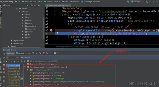然后启动远程调试,如果控制台出现:Connected to the target VM, address: 'ip地址:8888', transport: 'socket',就说明链接成功,然后在你需要调试的接口打上断点,在浏览器中请求改接口,就会进入该断点,我们就可以看到调试信息了。