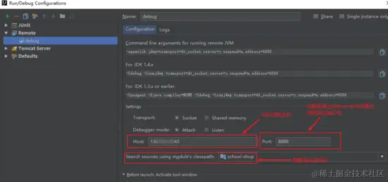 使用IDEA调试远程程序,需要在Run/EditConfidurations中添加Remote,并设置你需要调试的项目,以及该项目所在的远程主机和端口,如下图: