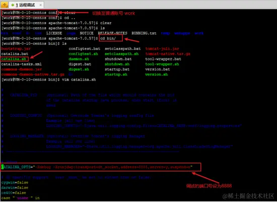 切换账号 su work,进入到根目录 cd ~,上传一个tomcat到work账号的根目录并进行解压,修改配置文件的信息 vim bin/catalina.sh