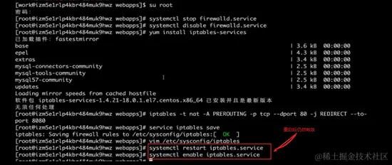 为了避免输入麻烦的端口号,我们如何不使用nginx,将80端口转发至8080端口,并让他永久生效呢。在centOS7之前,我么可以使用iptables来进行转发,但CentOs7之后就取消了。但我们可以通过安装iptables.service来进行设置,执行如下命令: