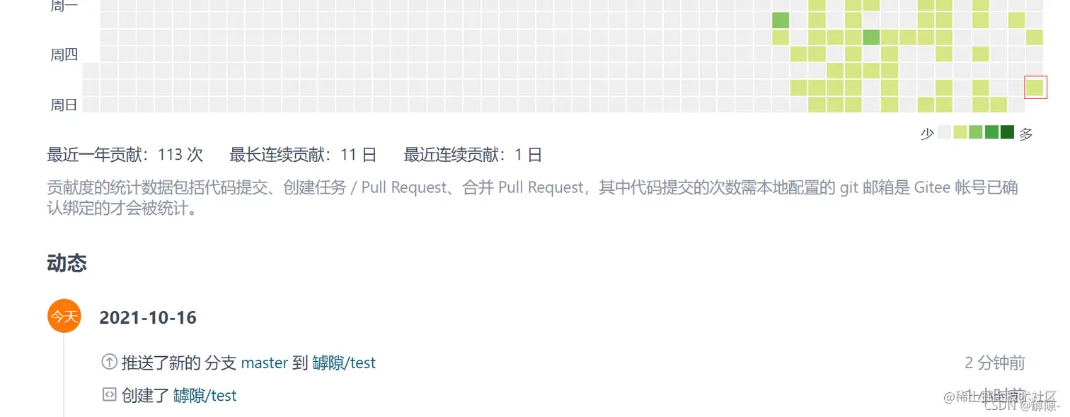 代码提交的次数需本地配置的 git 邮箱是 Gitee 帐号已确认绑定的才会被统计,所以最可能的原因是Gitee绑定的邮箱和git配置的邮箱不同或是用户名不同导致不被识别