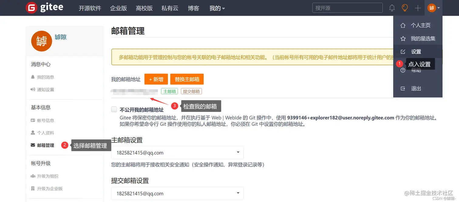查看gitee邮箱,同时注意不能选“不公开我的邮箱”一项。