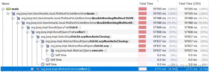 很明显,所有的版本都使用jOOQ进行查询构建、执行、映射,以达到公平和有意义的结果。在非MULTISET 方法中直接使用JDBC也是可能的,但这不是一个公平的概念比较。