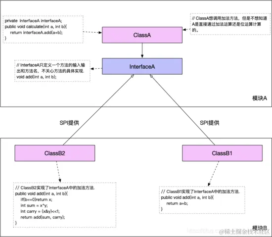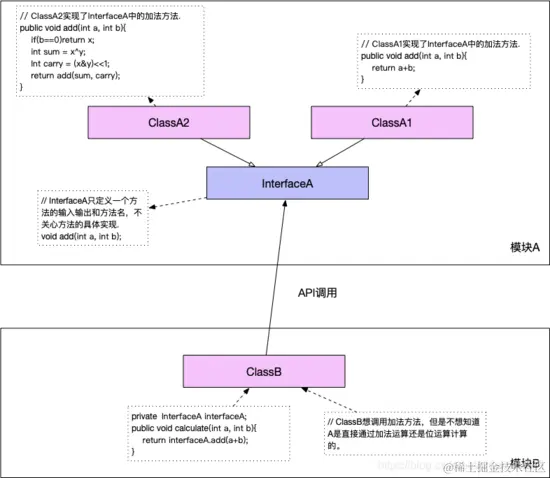 API (Application Programming Interface)在大多数情况下,都是实现方制定接口并完成对接口的实现,调用方仅仅依赖接口调用,且无权选择不同实现。 从使用人员上来说,API 直接被应用开发人员使用。如下图所示,其中模块 A 为接口制定方和实现方,而模块 B 为接口的使用放。