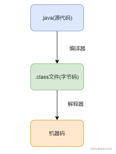 Java源代码---->编译器---->jvm可执行的Java字节码(即虚拟指令)---->jvm---->jvm中解释器----->机器可执行的二进制机器码---->程序运行