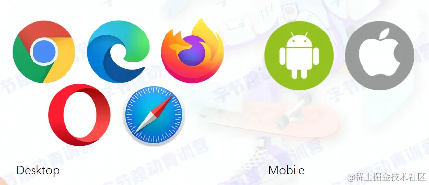 浏览器:桌面浏览器(谷歌,IE,Opera,火狐...)和移动端(安卓、苹果),