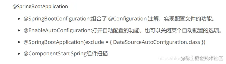 - @EnableAutoConfifiguration:打开自动配置的功能,也可以关闭某个自动配置的选项, 例 如: java 如关闭数据源自动配置功能: @SpringBootApplication(exclude = { DataSourceAutoConfiguration.class })。