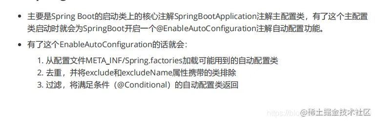 - 在sprinBoot启动时由@SpringBootApplication注解会自动去maven中读取每个starter中的spring.factories文件,该文件里配置了所有需要被创建spring容器中的bean,并且进行自动配置把bean注入SpringContext中 //(SpringContext是Spring的配置文件)