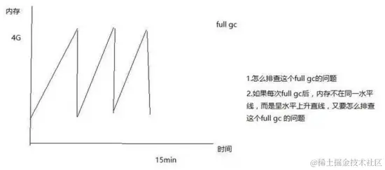 - 假设有下图所示的一个full gc 的图,纵向是内存使用情况,横向是时间,你如何排查这个full gc的问题,怎么去解决你说出来的这些问题。