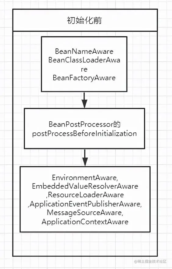 postProcessBeforeInitialization则会调用实现的 postProcessBeforeInitialization方法。在 ApplicationContextAwareProcessor类中实现了 postProcessBeforeInitialization方法。而这个类会在Spring刷新容器准备 beanFactory的时候会加进去,这里就会被调用,而调用里面会检查Bean是不是 EnvironmentAware, EmbeddedValueResolverAware, ResourceLoaderAware, ApplicationEventPublisherAware, MessageSourceAware, ApplicationContextAware的实现类。这里就会调用对应的实现方法。代码如下