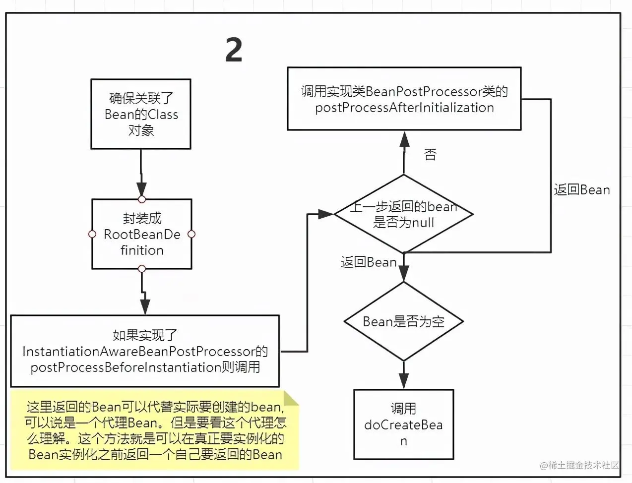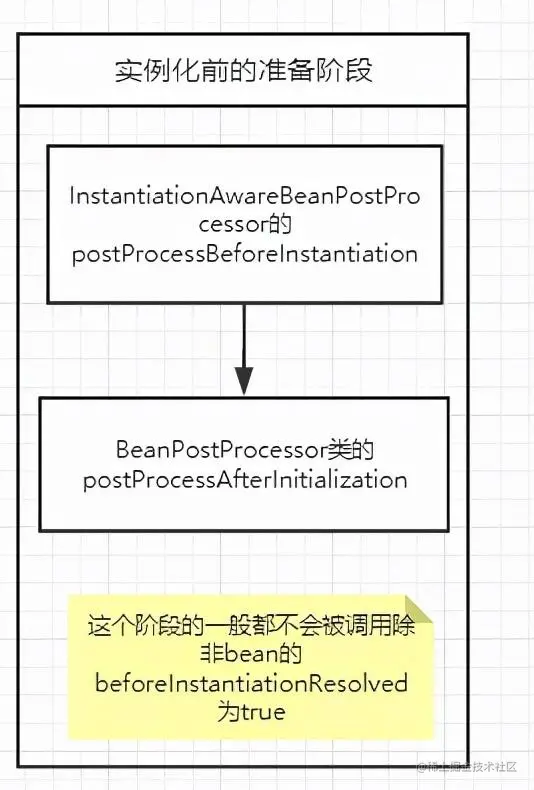 InstantiationAwareBeanPostProcessor接口的 postProcessBeforeInstantiation方法,然后获取返回的Bean,如果返回的Bean不是null还会调用实现的 BeanPostProcessor接口的 postProcessAfterInitialization方法,这里用代码说明