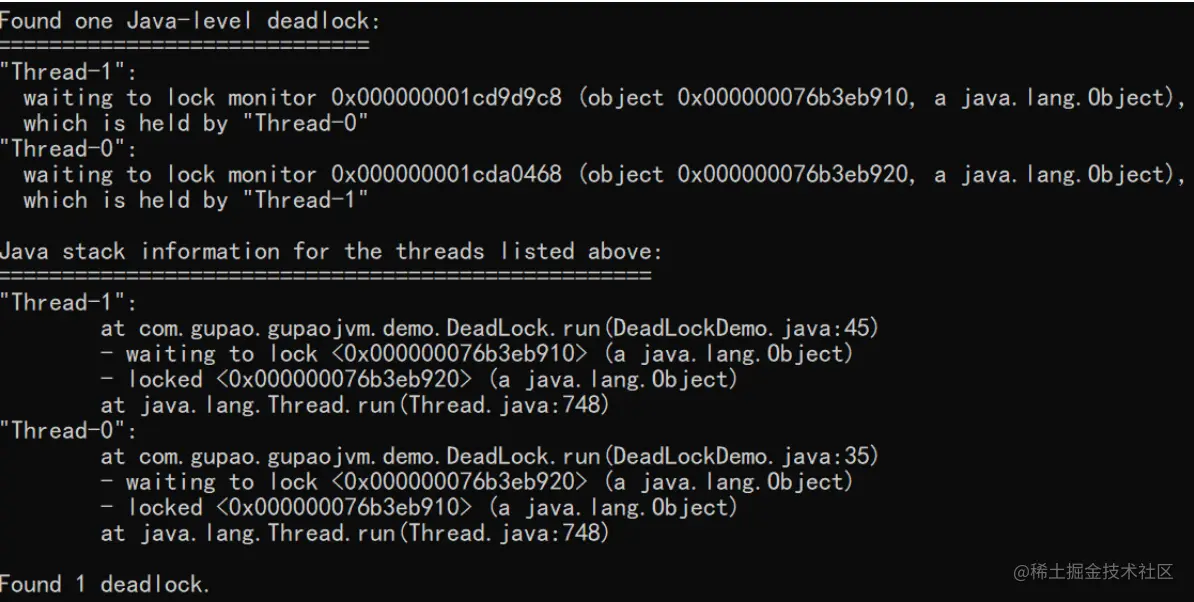 //运行主类public class DeadLockDemo{ public static void main(String[] args) { DeadLock d1=new DeadLock(true); DeadLock d2=new DeadLock(false); Thread t1=new Thread(d1); Thread t2=new Thread(d2); t1.start(); t2.start(); }}//定义锁对象class MyLock{ public static Object obj1=new Object(); public static Object obj2=new Object();}//死锁代码class DeadLock implements Runnable{ private boolean flag; DeadLock(boolean flag){ this.flag=flag; } public void run() { if(flag) { while(true) { synchronized(MyLock.obj1) { System.out.println(Thread.currentThread().getName()+"----if获得obj1锁"); synchronized(MyLock.obj2) { System.out.println(Thread.currentThread().getName()+"----if获得obj2锁"); } } } } else { while(true){ synchronized(MyLock.obj2) { System.out.println(Thread.currentThread().getName()+"----否则获得obj2锁"); synchronized(MyLock.obj1) { System.out.println(Thread.currentThread().getName()+"----否则获得obj1锁"); } } } } }}