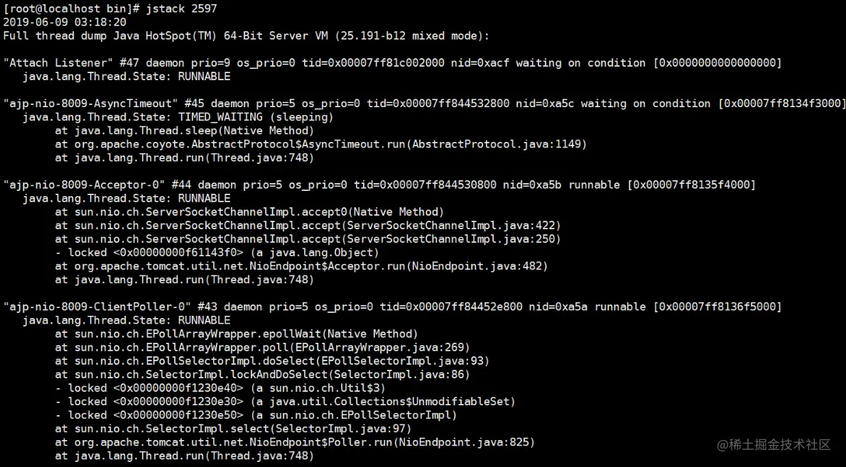 The jstack command prints Java stack traces of Java threads for a specified Java process, core file, or remote debug server.