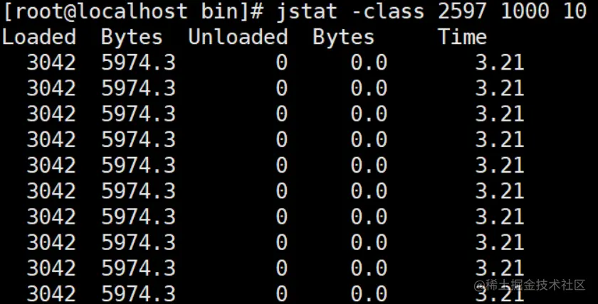 jstat -class PID 1000 10 查看某个java进程的类装载信息,每1000毫秒输出一次,共输出10次