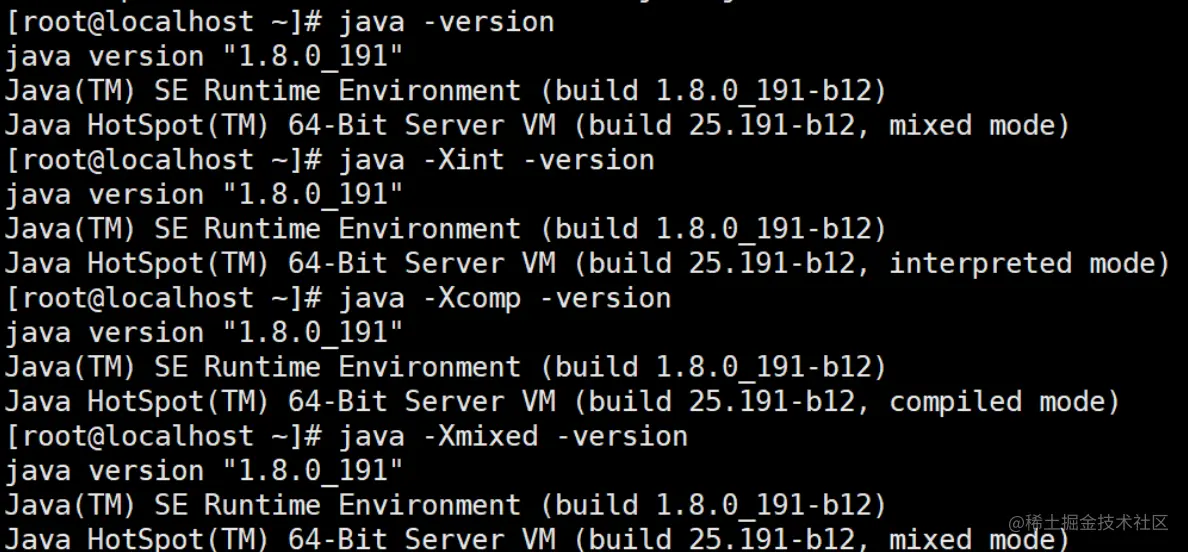 -Xint 解释执行-Xcomp 第一次使用就编译成本地代码-Xmixed 混合模式,JVM自己来决定