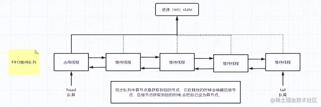 以独占锁为例,FIFO队列头节点获取到锁之后,其他节点会进入等待状态,释放锁之后,头节点的下一个节点会尝试获取锁,但是不一定成功(公平、非公平)。