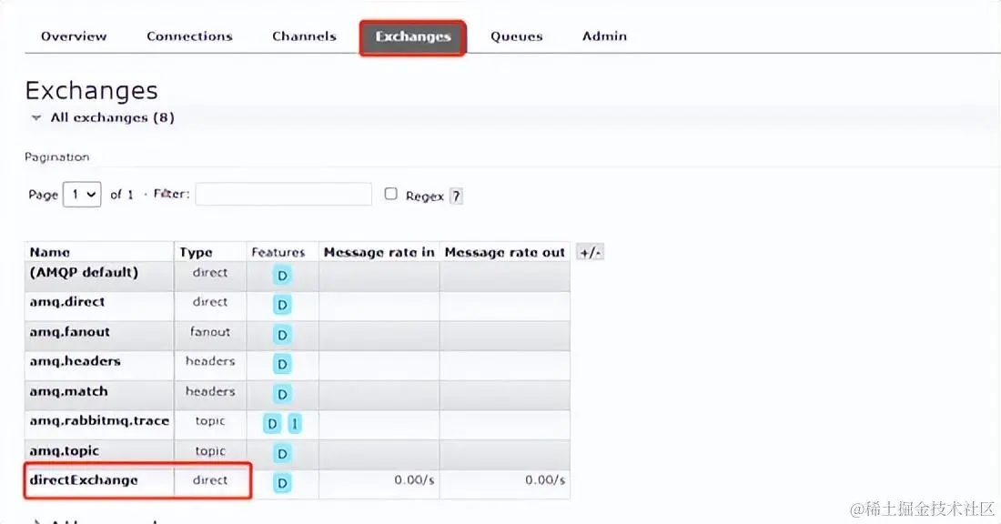 @Configurationpublic class DirectRabbitConfig { /** * 定义交换机 **/ @Bean public DirectExchange directExchange(){ /** * 交换机名称 * 持久性标志:是否持久化,默认是 true 即声明一个持久的 exchange,该exchange将在服务器重启后继续运行 * 自动删除标志:是否自动删除,默认为 false, 如果服务器想在 exchange不再使用时删除它,则设置为 true **/ return new DirectExchange("directExchange", true, false); } /** * 定义队列 **/ @Bean public Queue directQueue(){ /** * name:队列名称 * durable:是否持久化,默认是 true,持久化队列,会被存储在磁盘上,当消息代理重启时仍然存在 * exclusive:是否排他,默认为 false,true则表示声明了一个排他队列(该队列将仅由声明者连接使用),如果连接关闭,则队列被删除。此参考优先级高于durable * autoDelete:是否自动删除, 默认是 false,true则表示当队列不再使用时,服务器删除该队列 **/ return new Queue("directQueue",true); } /** * 队列和交换机绑定 * 设置路由键:directRouting **/ @Bean Binding bindingDirect(){ return BindingBuilder.bind(directQueue()).to(directExchange()).with("directRouting"); }}