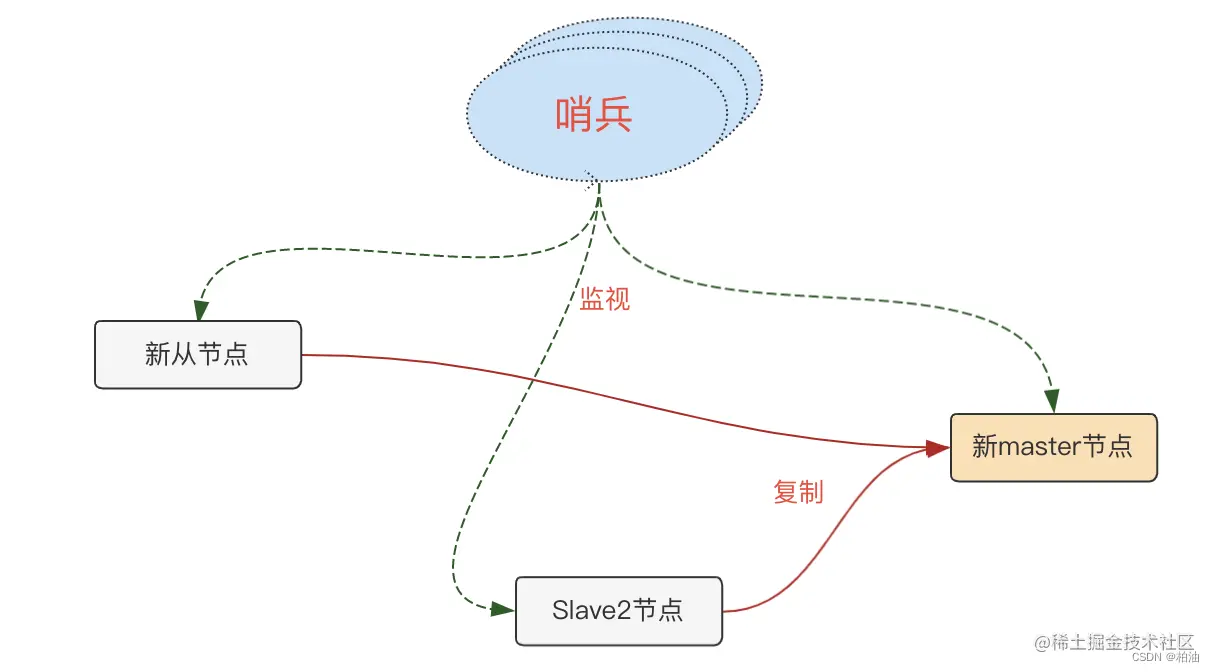 另外,前面部分提到,单哨兵可能并不是那么健壮,我们一般需要搞一个哨兵集群。因此,第三项职责便是哨兵节点间的沟通交流。