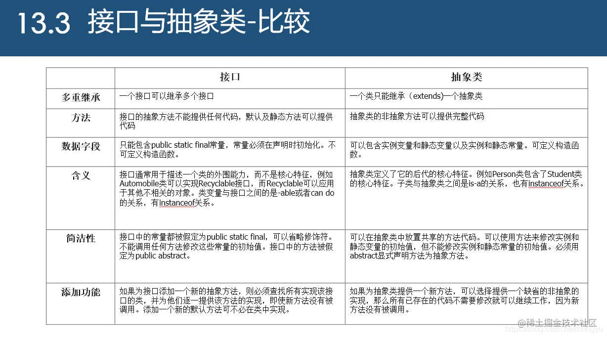 - 抽象类不能被实例化,即不能用new关键字创建对象;抽象类可以定义构造函数,可以被子类调用;具体子类必须实现抽象父类中所有抽象方法,否则子类需要声明为抽象类;抽象类只能用具体子类的对象实例化。