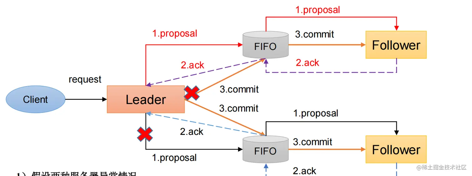由于Leader崩溃,会导致之前的数据提交出现异常,见下图: