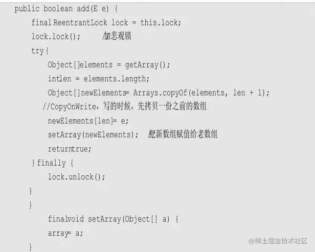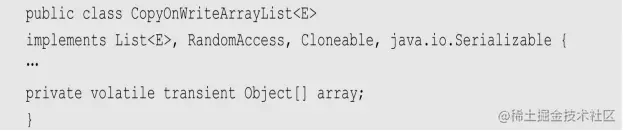 和ArrayList一样,CopyOnWriteArrayList的核心数据结构也是一个数组,代码如下。