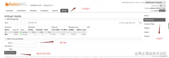 将配置中host,port,username,password改为你自己的即可,并且记得去RabbitMQ可视化控制台创建一个名为dev的host,具体操作如下: