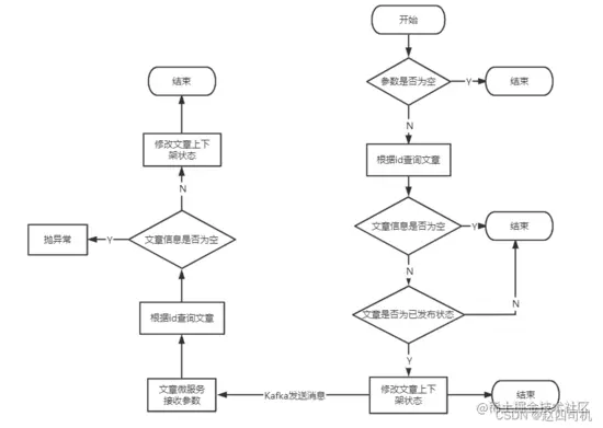 后端接收到前端传过来的参数之后要先做一个校验,参数不为空才能继续往下执行,首先应该根据前端传过来的文章id(自媒体端文章id)查询自媒体数据库的文章信息并判断该文章是否已是发布状态,因为只有审核成功并成功发布了的文章才能进行上下架操作。自媒体端微服务对文章上下架状态进行修改之后便可以向Kafka发送一条消息,该消息为Map对象,里面存储的数据为移动端的文章id以及前端传过来的上下架参数enable,当然要将该Map对象转换成JSON字符串才能进行发送。