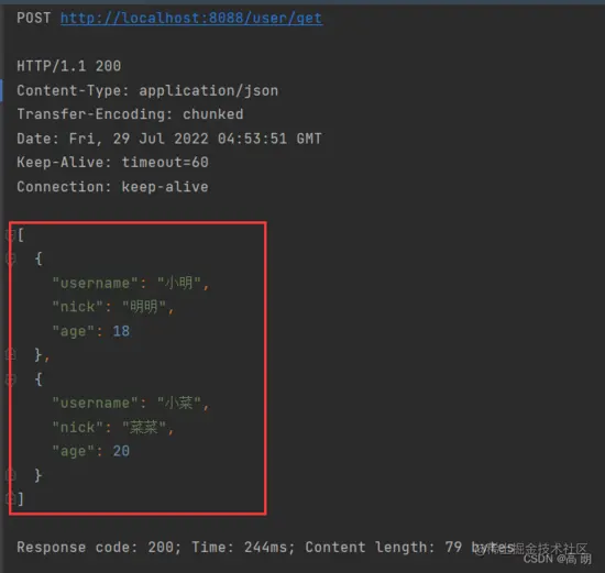 访问 POST http://localhost:8088/user/get ,最好不要用浏览器访问,浏览器默认的是get请求方式,可能会报405错误,可以修改Controller请求的方法,改为get方式。