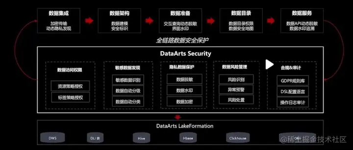 - 全链路数据安全保障,数据集成、传输、存储、数据架构设计、开发准备、资产搜索、服务开放等全链路都集成了数据安全能力。