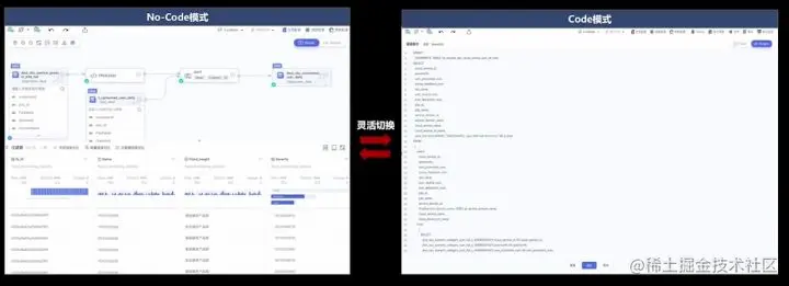 - 融合code模式与no-code模式:支持No-code模式开发流/批数据处理作业,作业节点数量降低20%,数据作业开发效率由天级别降到小时/分钟级别;