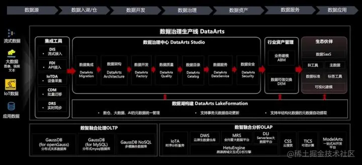 数据治理生产线DataArts可以帮助企业的数据源进行:数据接入、数据开发、数据治理、数据资产、数据服务、数据安全、数据共享,最终转化成为数据应用。就像生产线一样,能够把海量复杂,无序数据,转化成为高质量的数据能源并输送给业务,实现数据驱动、实时决策。