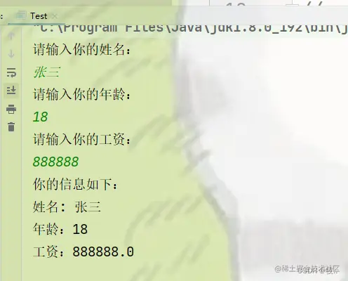 System.out.println("姓名: "+name+"\n"+"年龄:"+age+"\n"+"工资:"+salary);