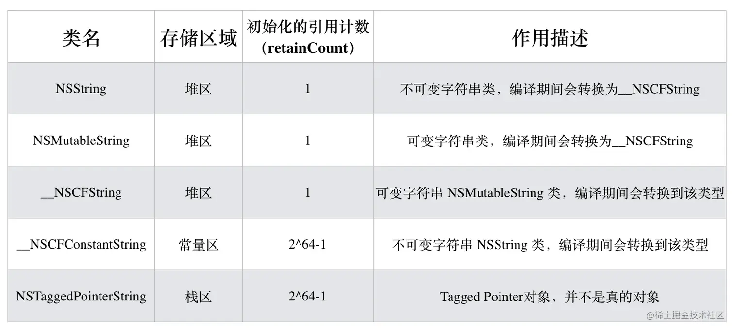 - Tagged Pointer类型:NSTaggedPointerString,通过对象方法创建的短字符串。