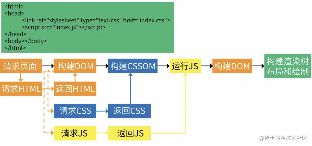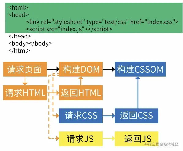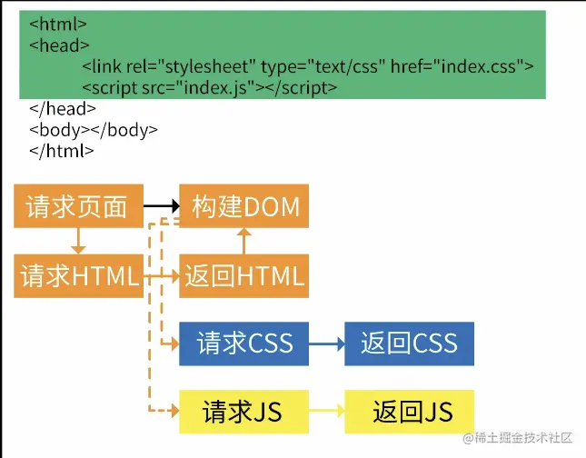 浏览器发送请求,服务器或者本地返回给浏览器HTML文件,第一步就是解析html文件,返回html文件并且构建DOM,在解析HTML文件的时候就遇到了link标签,浏览器就去请求CSS文件,请求CSS文件的同时继续解析HTML文件,此时遇到了script标签,浏览器就去请求JS文件,服务器或者本地就会陆续返回CSS和JS文件,实际操作中先得到CSS还是JS文件是要看具体情况的。