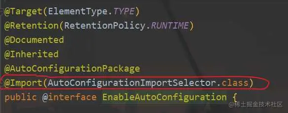 点击SpringBootApplication注解进入,可以看到@EnableAutoConfiguration注解,继续点击这个注解进入到里面