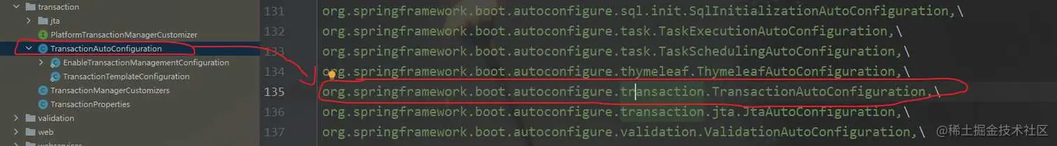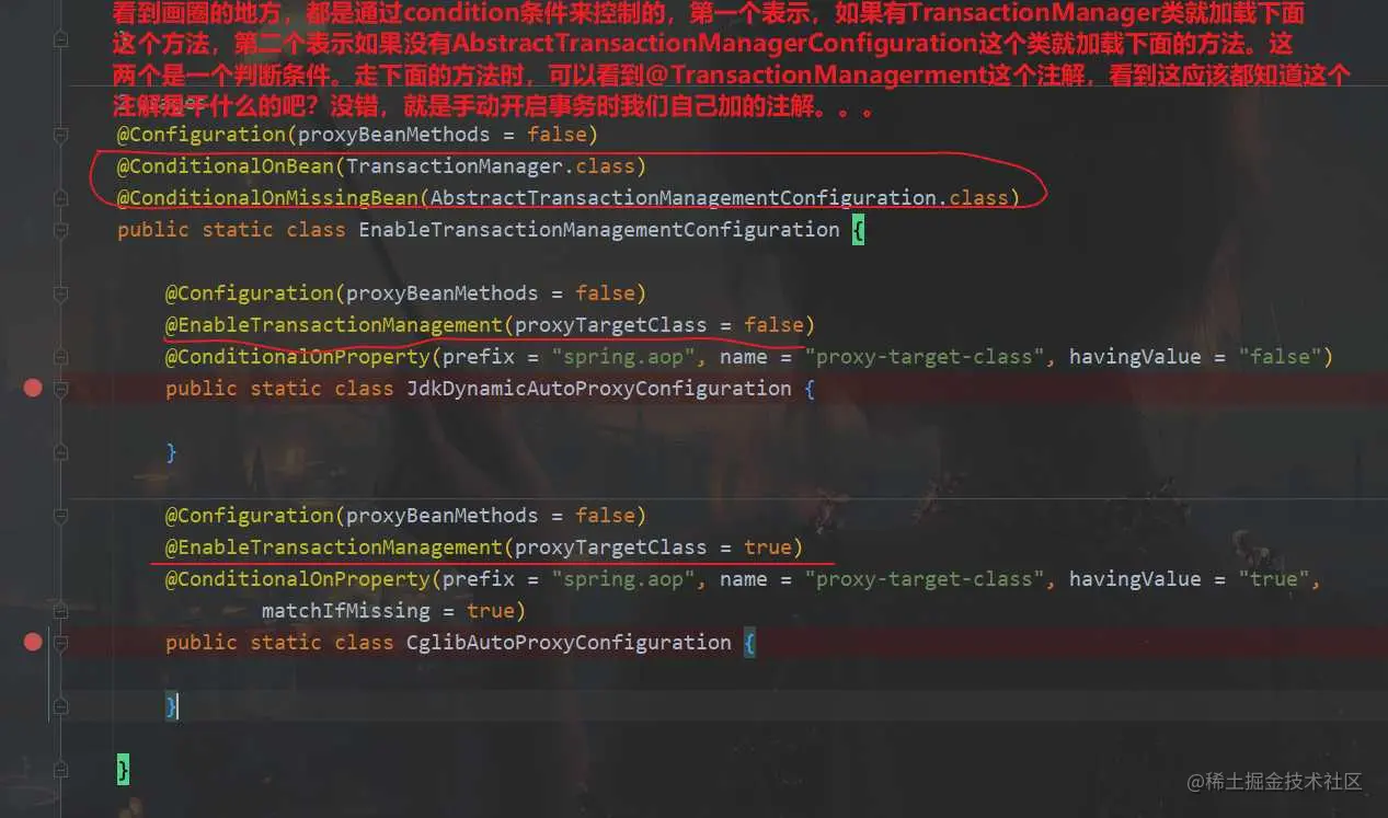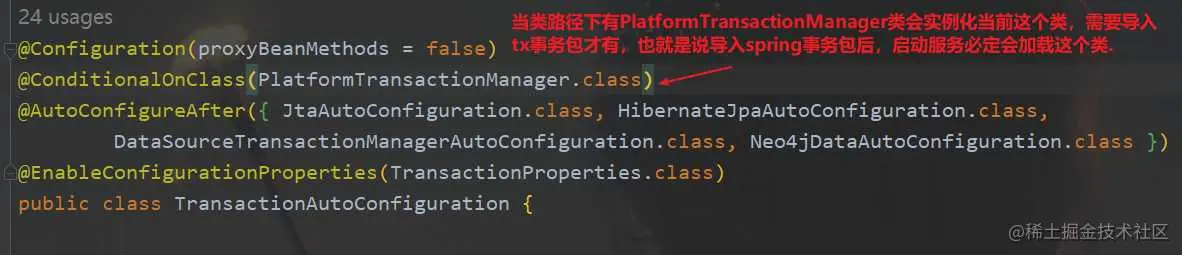 注意看最后一张图里的@EnableTransactionManagement注解,我们自己开启事务时候会写这个注解的,也就是说,如果不写这个注解,默认服务启动会加载这个类,如果写了,就不加载这个类了。